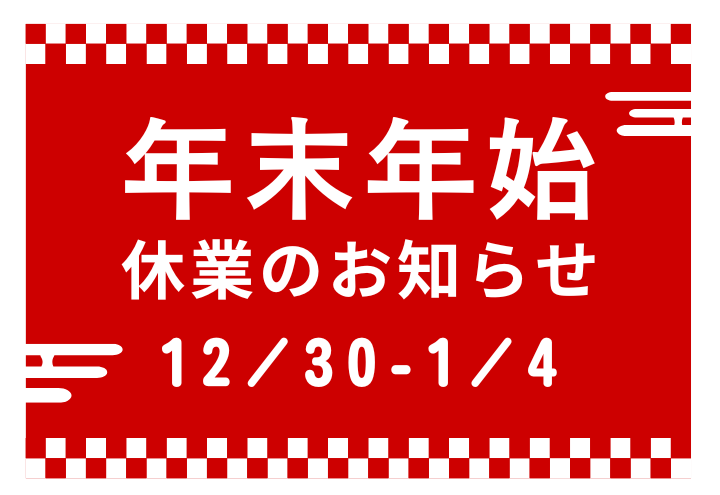 2024.12.11 2025.12.26 ’25-’26 年末年始営業のお知らせ Post Share LINE Pin it note いつも、ご愛顧頂き、誠にありがとうございます。 年末年始の営業についてご案内いたします。 12月27日(土)12時までご注文受付分:年内発送 以降、1月5日(月)より順次発送となります。 どうぞ、宜しくお願い申し上げます。